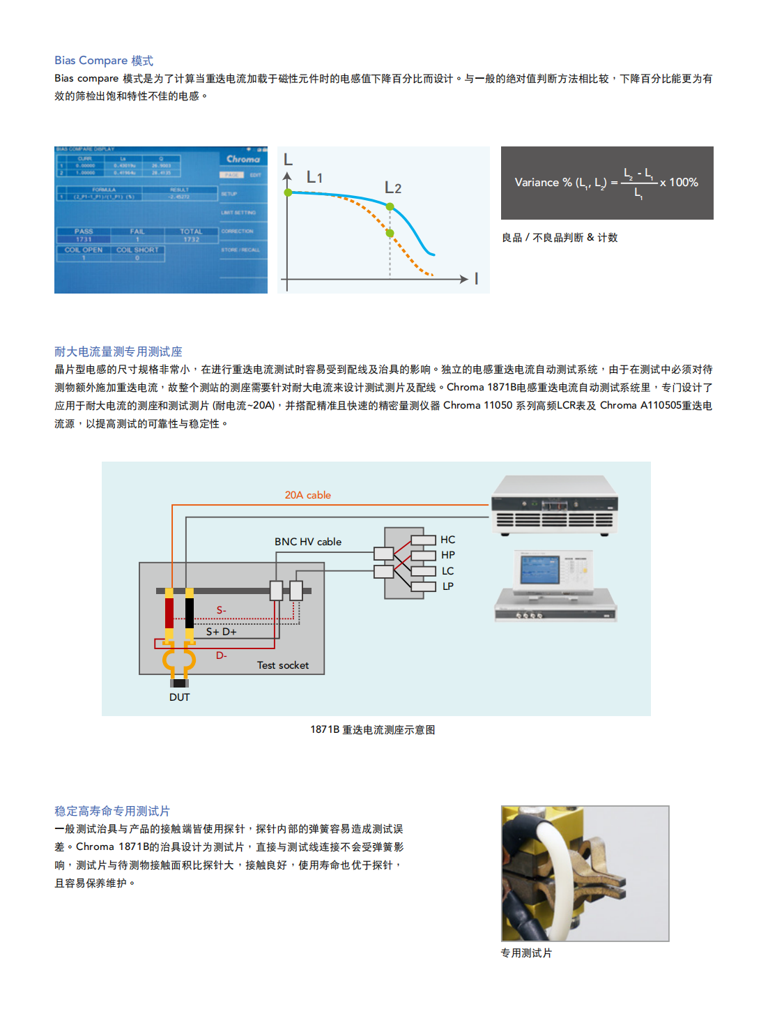 Chroma 1871B是专门为晶片型功率电感特别针对重迭电流测试所设计的自动化测试生产设备,主要因应全球车用市场严格的安全标准要求,替使用于车用产品的电子元件做更完整的功能、规格之检测。